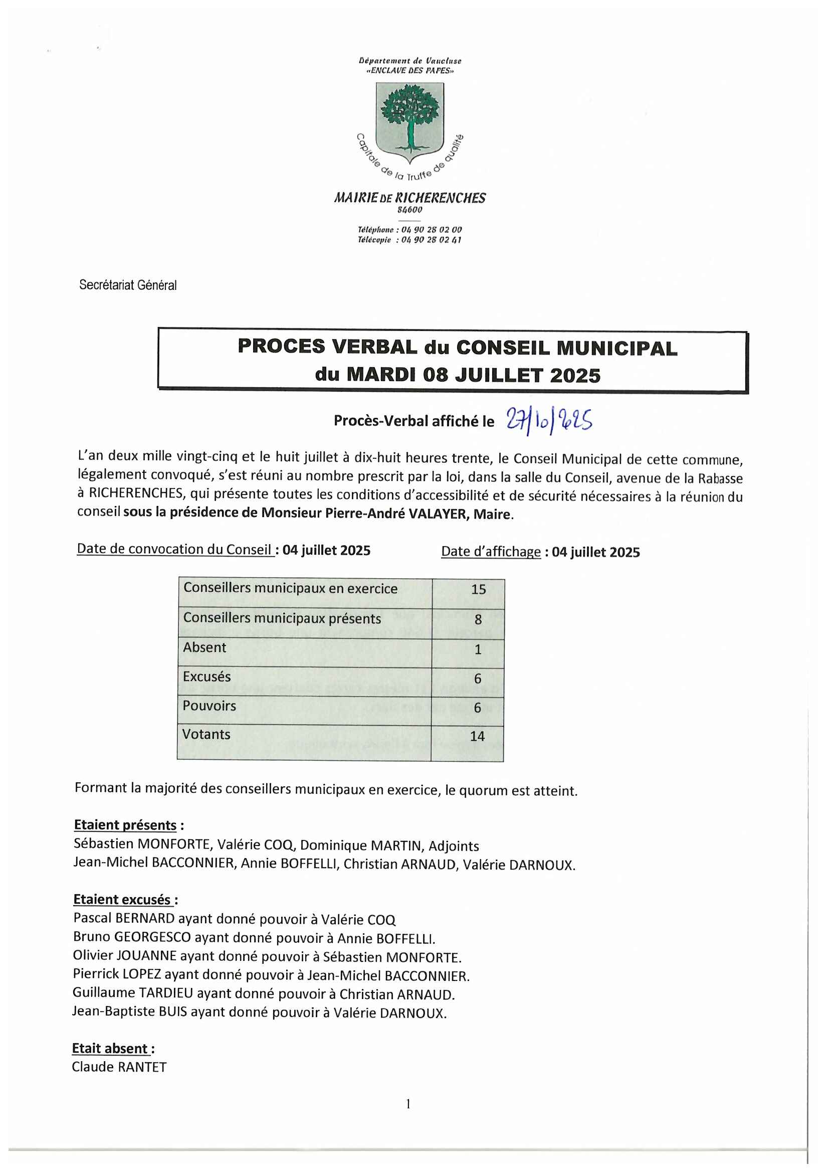 Vous êtes ici : Accueil > Procès Verbal du Conseil Municipal du 08 juillet 2025